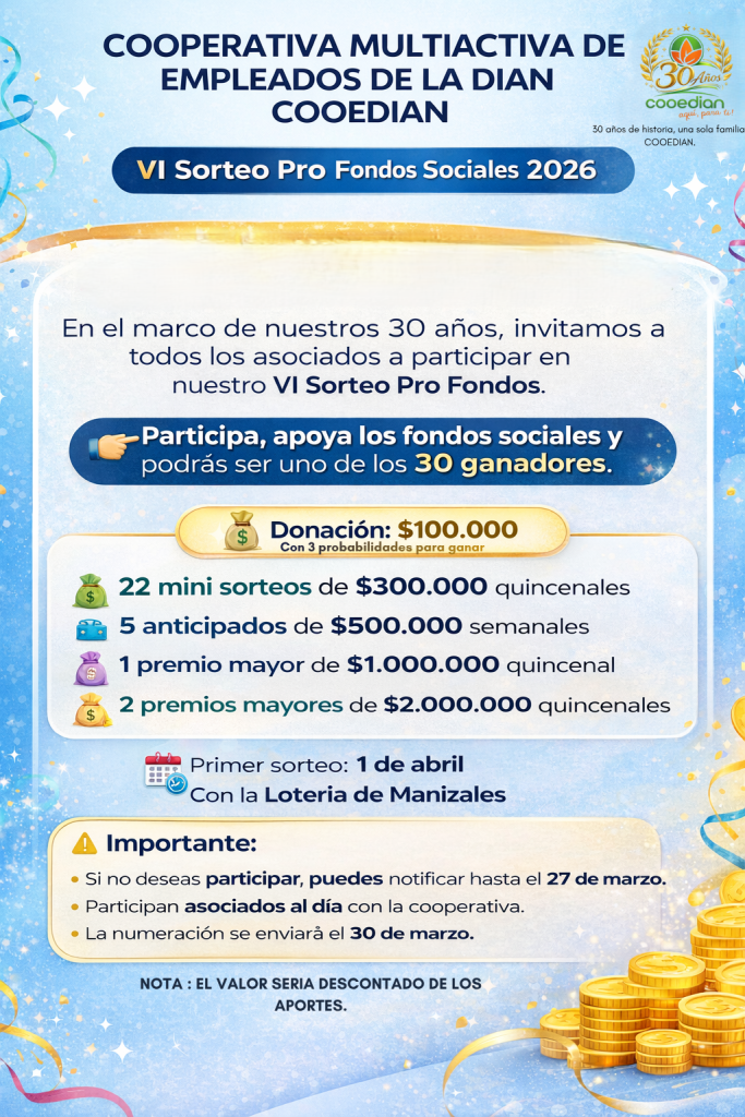 Estimados Asociados. En cumplimiento con la Planeación Estratégica de COOEDIAN, el Comité de Educación de COOEDIAN, con el apoyo con el Consejo de Administración y de la Gerencia, lo invita a participar del VI Sorteo Pro-Fondo con el fin de fortalecer los fondos sociales de la cooperativa y brindar mayores beneficios. Con lo anterior, te invitamos a apoyar esta actividad: